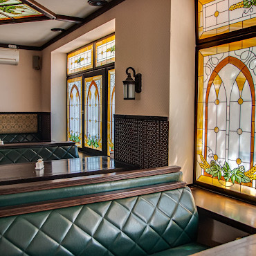 Заведение находится рядом со сквером Мичурина и предлагает банкетные залы с классической обстановкой – светлыми обоями и гардинами.